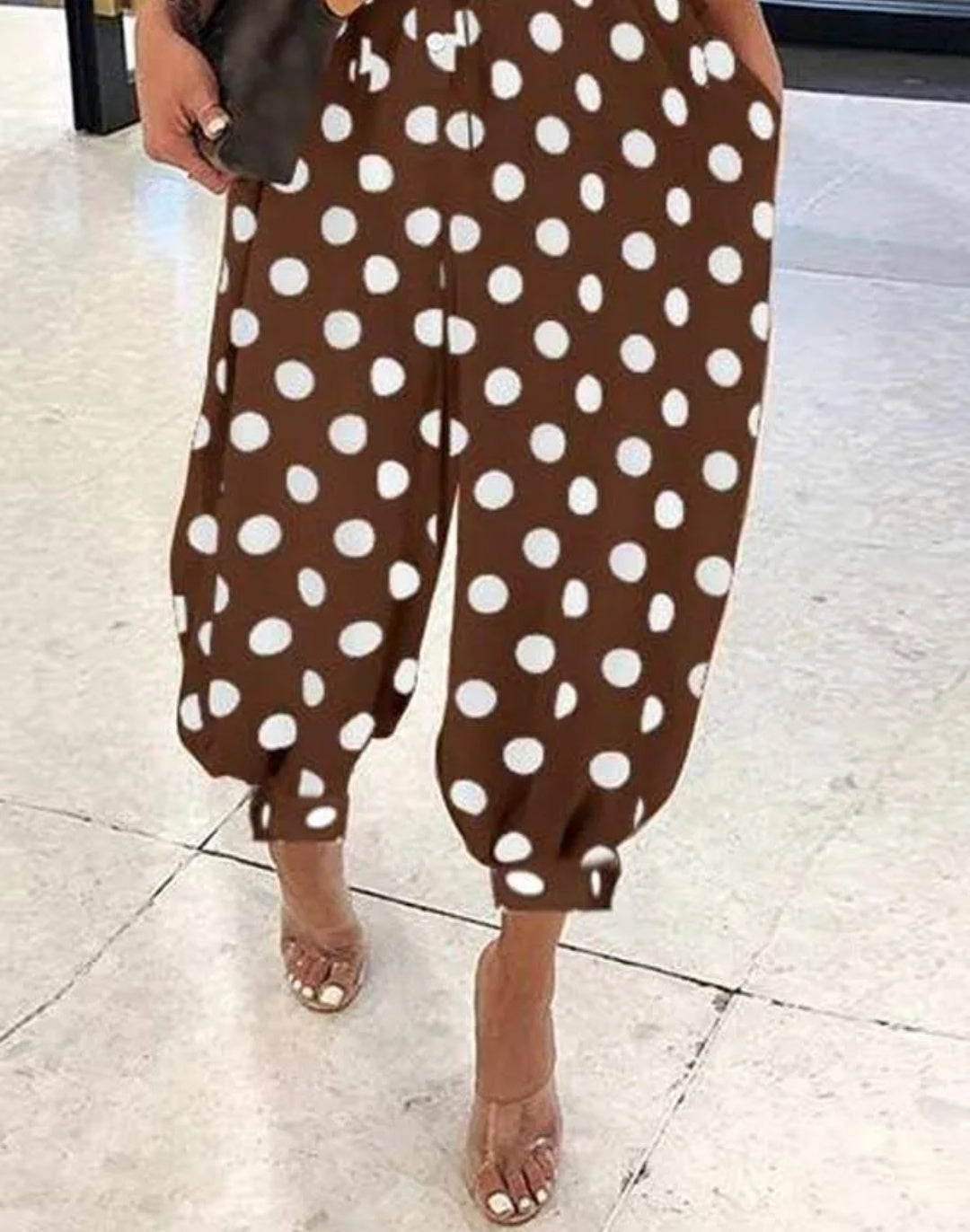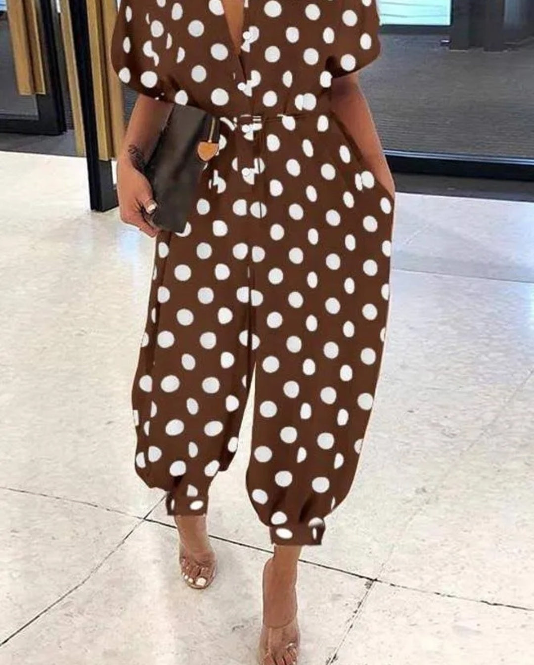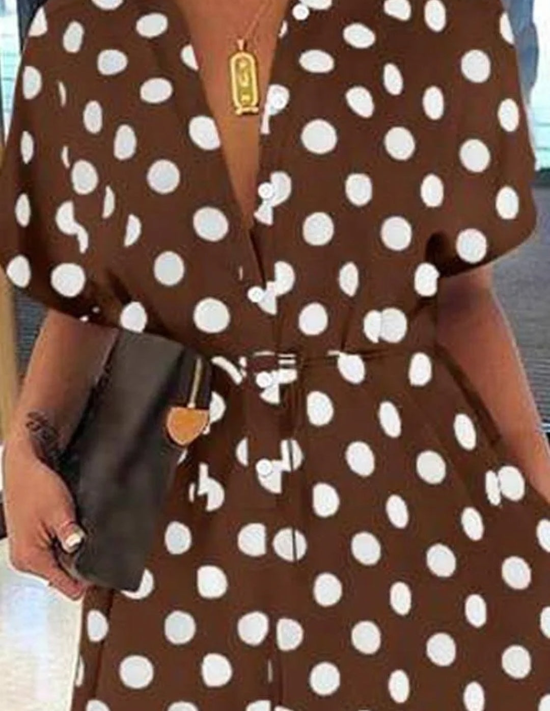 Brown & White polka dot all in one jumpsuit. Front button closure. Ankle length, light weight, great for spring/summerGood to pair with shoes, flip flops. Very comfortable. Suggests to order 1 size up for item runs small.